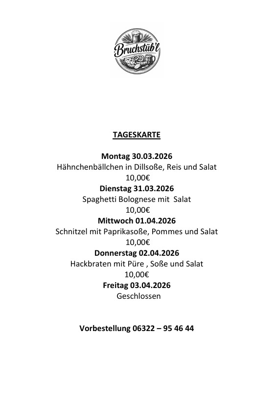 Offiziele Website des Bruchstüb'l. Aktuelle Gerichte finden Sie in der Tageskarte vor Ort oder als PDF auf unserer Website.